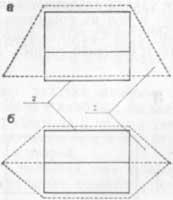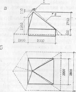 | Рис. 2. Схема шатровой четырехскатной палатки | Рис. 3. Схема трехскатной палатки: а — общий вид; б — вид сбоку: 1 — тент |