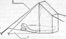 | Рис. 7. Схема, доработки односкатной палатки: 1 — входное полотнище; 2 — марлевый полог |
