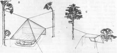 | Рис. 8. Схема установки тента в лесу: а — с центральной оттяжкой; б — с боковыми оттяжками |