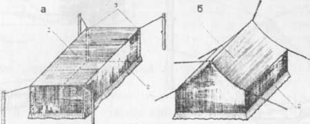 | Рис. 1. Схема призматических палаток: а — односкатных; б — двухскатных типа “домик” |