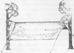 Во время путешествий по сильно заболоченному лесу или в период весенних разливов, когда трудно найти сухое место для установки палатки, устраивают гамак (рис. 11). Для него берут полотнище из тонкого брезента шириной 60—70 см и длиной 2 м. В качестве тента можно использовать подходящий по размеру кусок полиэтилена. Все это вместе занимает мало места и весит 0,5—0,7 кг. При этом отпадает надобность в надувном матрасе или коврике.