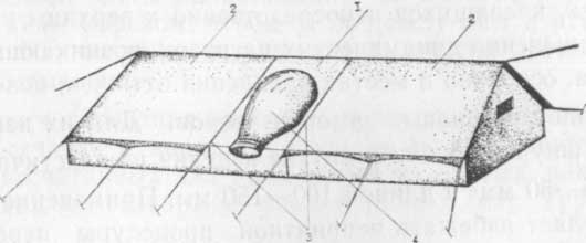 | Рис. 14. Схема установки оттяжек: 1 — оттяжки; 2 — колышки; 3 — высота стенки; 4—длины оттяжек |