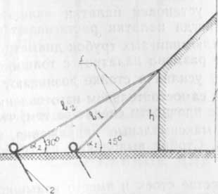 Длину оттяжек выбирают так, чтобы угол между поверхностью почвы и оттяжкой был не более 45°, иначе колышки будут плохо держаться в почве (рис. 14). Если этот угол уменьшить до 30°, то для выдергивания колышек потребуется применить вдвое большее усилие, чем при угле в 45°.