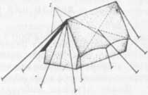 | Рис.15. Схема одновременной растяжки крыши и пола палатки | Рис.16. Схема применения дополнительных оттяжек: 1 — дополнительные оттяжки |
